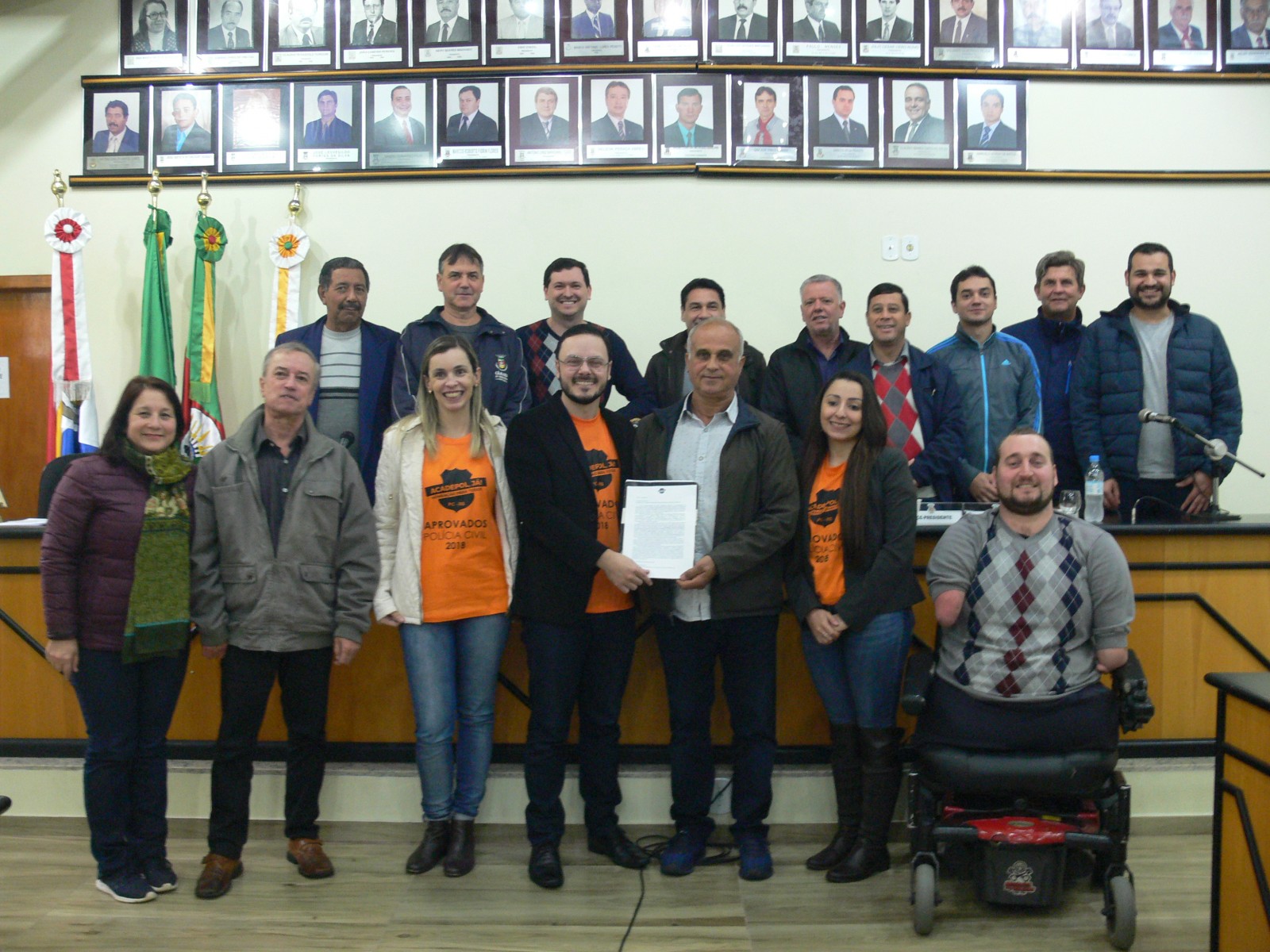 Durante a sessão Ordinária da câmara de vereadores do dia 13 de maio, representantes da Comissão dos aprovados no concurso público para a Polícia Civil no ano de 2018, Pedro Martins, Siméia Brum e Giovana Schulz estiveram no Plenário, oportunidade em que entregaram ao presidente e demais vereadores um ofício solicitando uma moção de apoio para que o Governo do Estado faça a nomeação dos aprovados para o início do curso na Academia da Polícia Civil do RS, para os cargos de Escrivão e Inspetor de Polícia.