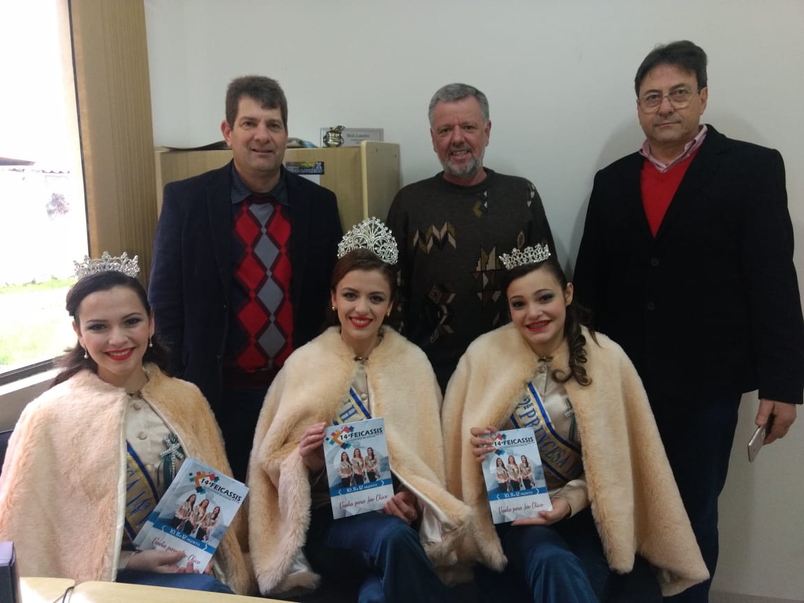 O Presidente da Câmara de Vereadores Décio Loureiro recebeu na manhã desta terça –feira 24 de julho o Sr. Rubemar Paulinho Salbego ( Prefeito de São Francisco de Assis) ,o Sr. Domingo Bianchini( Secretario da Industria e Comércio) juntamente com as soberanas da 14° FEICASSIS 2018,as senhoritas; Thalia Lunard-Rainha da FEICASSIS 2018, Evelin Trombini 1° Princesa e Andressa Vessoza 2° Princesa, para divulgação e convite da Feira Regional da Industria e Comércio, Agroindústria, Artesanato e Serviços de São Francisco de Assis que ocorrerá de 10 à 12 de Agosto de 2018.