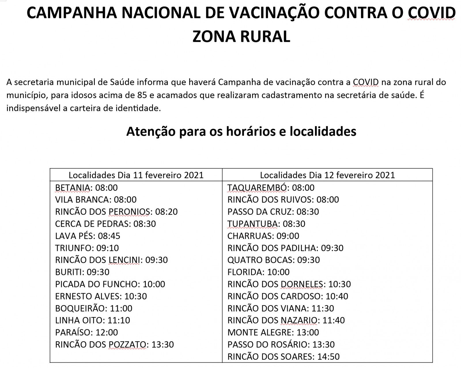 | BETANIA: 08:00VILA BRANCA: 08:00RINCÃO DOS PERONIOS: 08:20CERCA DE PEDRAS: 08:30LAVA PÉS: 08:45 TRIUNFO: 09:10 RINCÃO DOS LENCINI: 09:30 BURITI: 09:30 PICADA DO FUNCHO: 10:00 ERNESTO ALVES: 10:30 BOQUEIRÃO: 11:00 LINHA OITO: 11:10 PARAÍSO: 12:00 RINCÃO DOS POZZATO: 13:30 | TAQUAREMBÓ: 08:00RINCÃO DOS RUIVOS: 08:00PASSO DA CRUZ: 08:30TUPANTUBA: 08:30CHARRUAS: 09:00 RINCÃO DOS PADILHA: 09:30 QUATRO BOCAS: 09:30 FLORIDA: 10:00 RINCÃO DOS DORNELES: 10:30 RINCÃO DOS CARDOSO: 10:40 RINCÃO DOS VIANA: 11:30 RINCÃO DOS NAZARIO: 11:40 MONTE ALEGRE: 13:00 PASSO DO ROSÁRIO: 13:30 RINCÃO DOS SOARES: 14:50 |