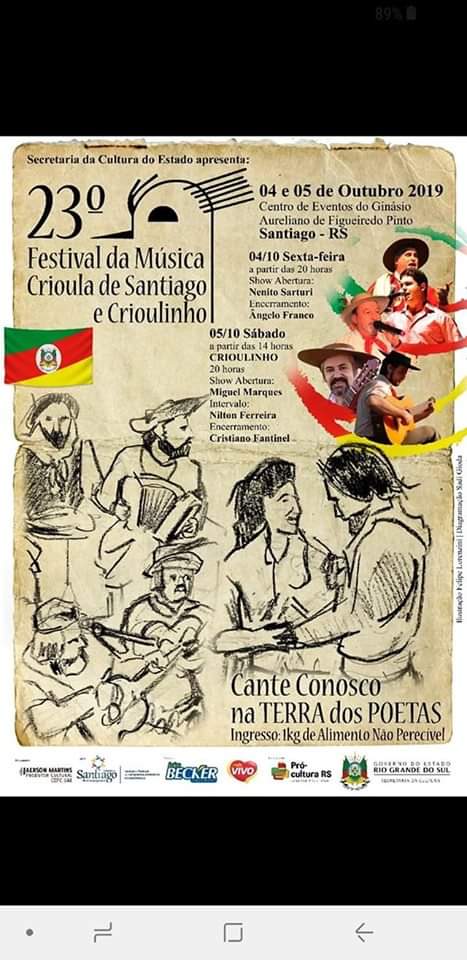 Nesta última sexta-feira, dia 04 de outubro, iniciou a 23° edição do Festival da Musica Crioula de Santiago, trazendo novamente ao nosso município a boa música tradicionalista de Santiago e região.