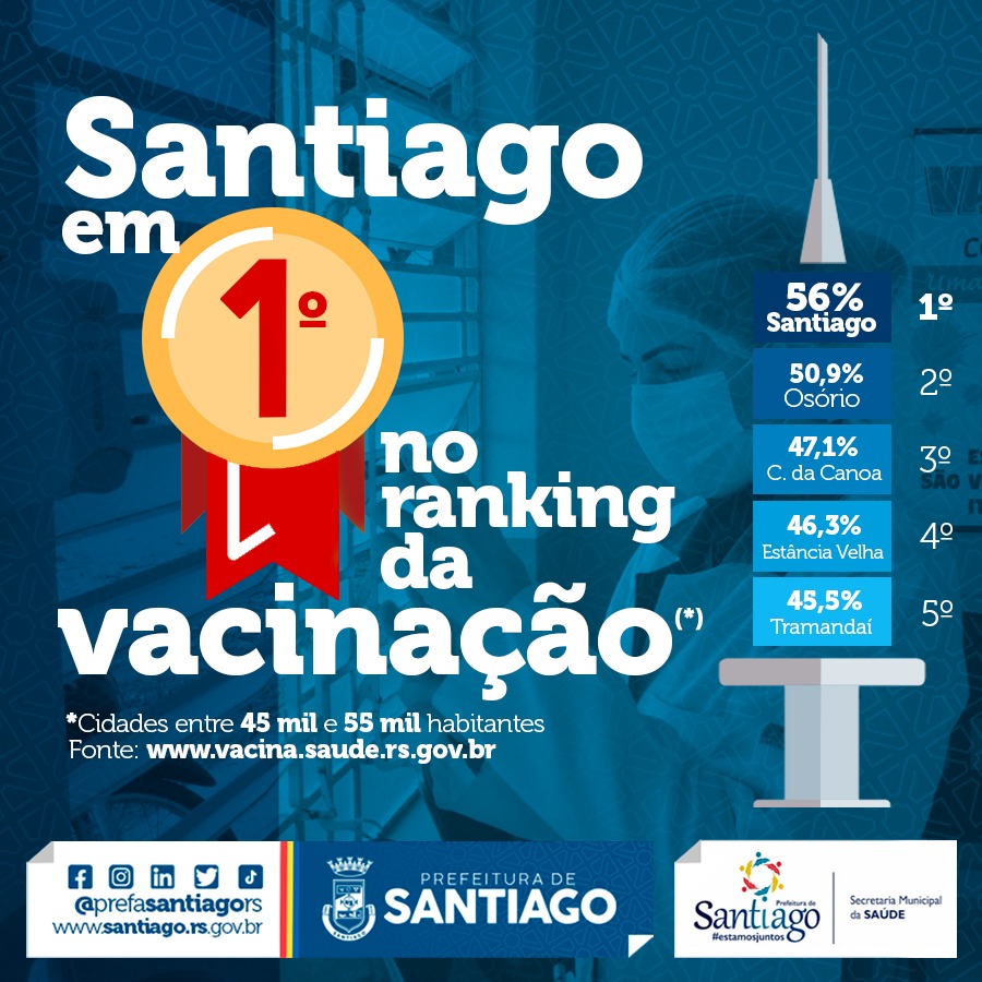 A cidade de Santiago é a cidade que mais vacina no Rio Grande do Sul na faixa entre 45 e 55 mil habitantes. Com 56% de vacinados, o município fica à frente de cidades como Osório, Capão da Canoa, Estância Velha e Tramandaí, que completa o ranking das cinco que mais aplicaram pelo menos uma dose do imunizante contra Convid-19.