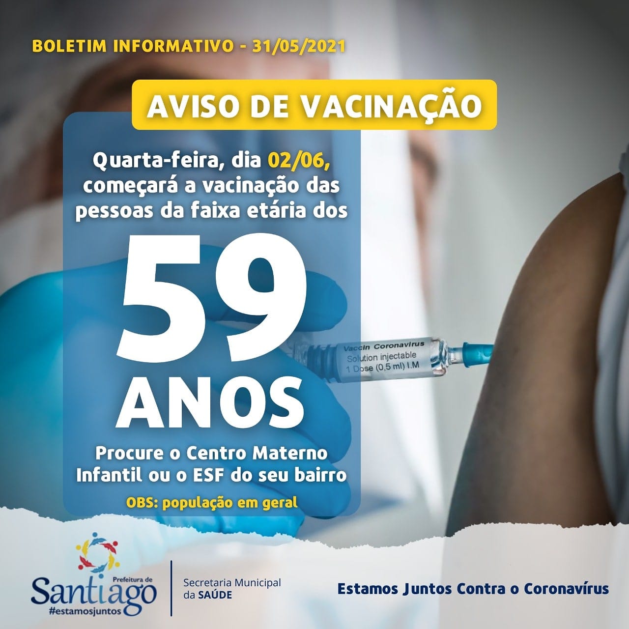 A secretaria de Saúde já está vacinando santiaguenses com 59 anos. O processo de imunização para essa faixa etária iniciou nessa quarta-feira, 2 de junho.