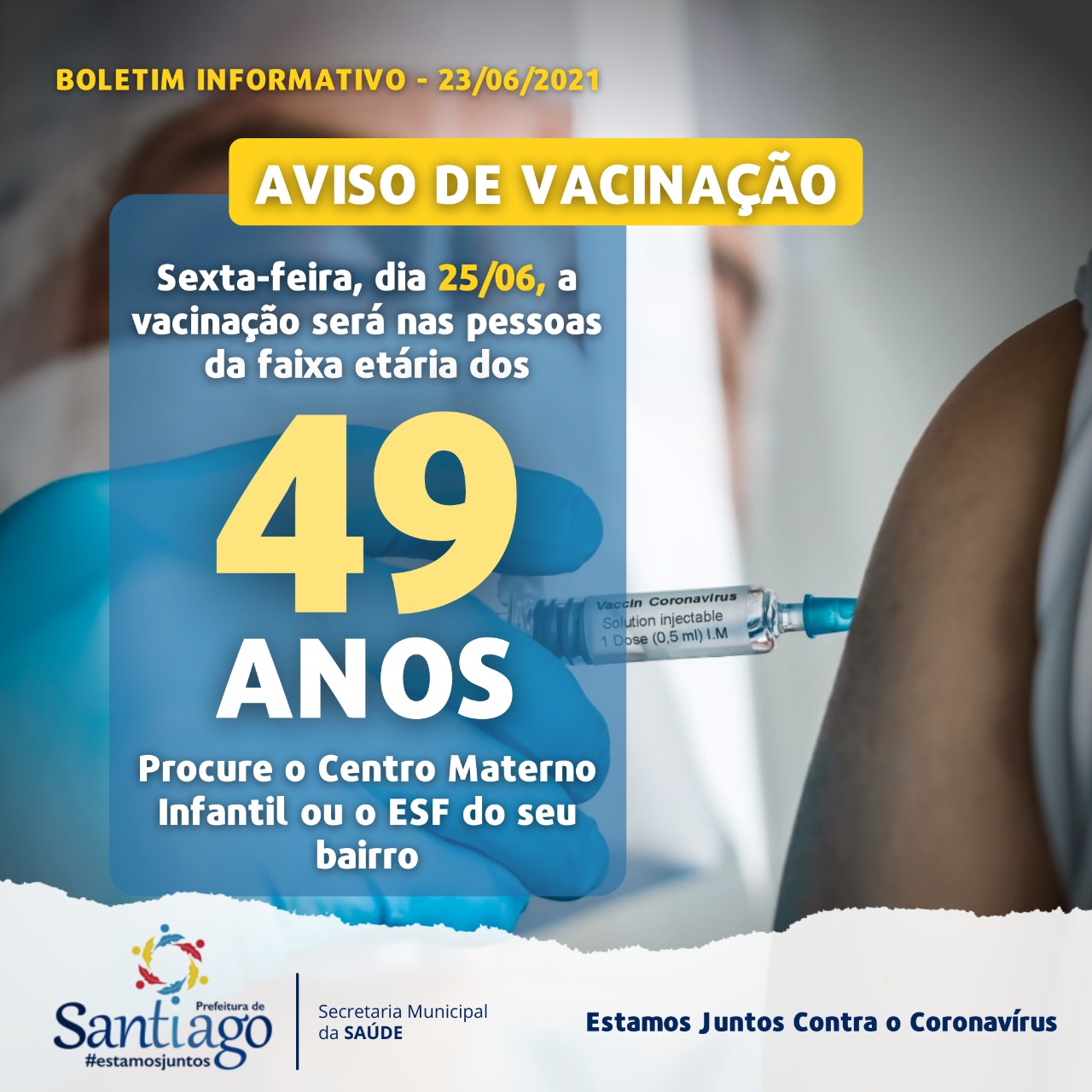 A Secretaria Municipal de Saúde confirmou na noite de quarta-feira que os santiaguenses na faixa dos 49 anos receberão a primeira dose de vacina contra Covid-19 nesta sexta-feira (25).