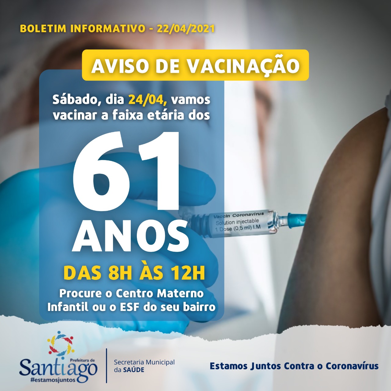 A Secretaria Municipal de Saúde confirmou na manhã dessa sexta-feira (23) que santiaguenses com 61 anos ou mais poderão se vacinar no sábado (24).
