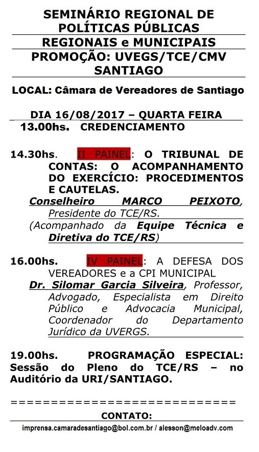 A Câmara de Vereadores de Santiago, o TCE-RS (Tribunal de Contas do RS) e a UVERGS (União dos Vereadores do RS) estarão realizando no dia 16 de agosto de 2017, quarta-feira, a partir das 13 horas, nas dependências da Câmara de Vereadores de Santiago o Seminário Regional de Políticas Públicas Regionais e Municipais.