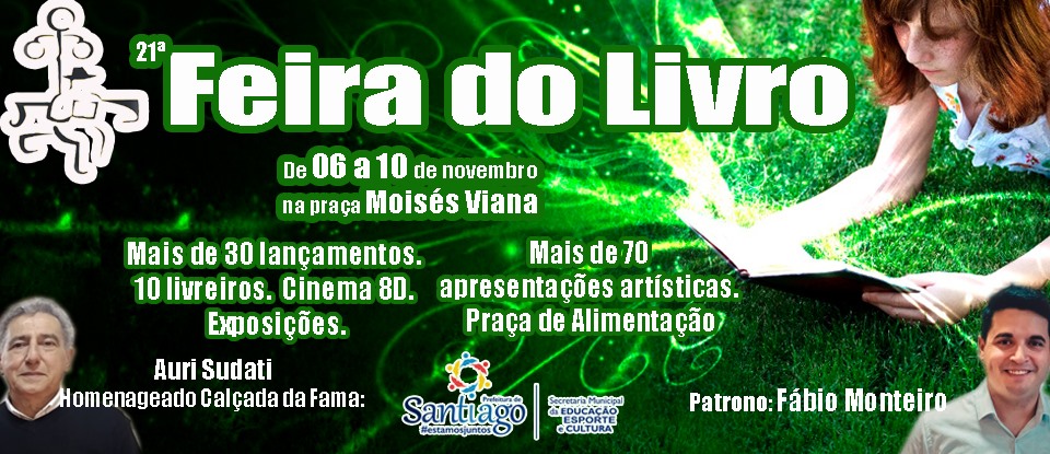 A Feira do Livro de Santiago é uma realização do Departamento de Cultura da Secretaria Municipal de Educação, e é o maior evento cultural da Terra dos Poetas, que vai acontecer de 06 a 10 de novembro na praça Moisés Viana .