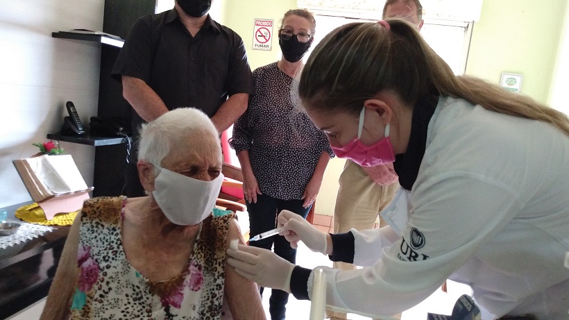 Reasilva dos Reis, de 93 anos, foi a primeira vacinada contra a Covid 19 no Asilo Santa Isabel. Quem aplicou a dose foi a enfermeira Mariana Berger Bolzan, 26 anos.